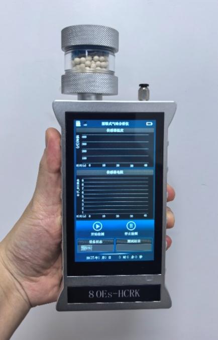 手持式气味检测仪是一套基于MEMS微热板八嗅元气味传感器的检测设备,主要由供电通讯模块、显示操作模块、气体采集及检测模块三部分组成,供电通讯模块采用5000mA电池供电,可通过Type-C有线通讯,也可以通过自带蓝牙/WIFI实现无线通讯功能,外接12V电源供电或充电。显示操作模块采用5寸彩色电容触摸显示屏,带16G容量TF卡存储测试和数据库数据。气体采集及检测模块包含1个八嗅元气味传感器、微型采样腔、微型采样泵、一体式三通阀,可进行泵吸式采样。设备带有PC端气味检测软件,可对众多气味实现精细检测与识别。