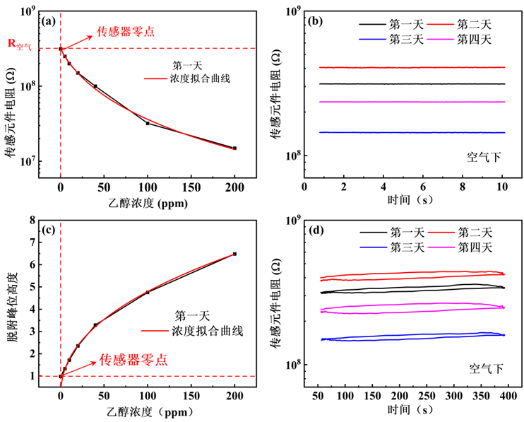 (c)传感器对不同浓度乙醇的脱附峰位高度,(d)四天内空气下的脱附峰位高度