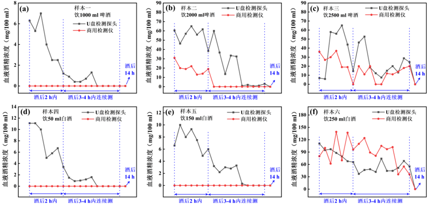 下图为U盘式酒驾检测仪与商用产品的酒后实测数据(纵坐标为换算后对的血液中乙醇浓度),样本一至六为不同人员,分别饮1000~2500 ml啤酒(雪花:勇闯天涯),以及50~250 ml白酒(二十年白云边,兼香型),测试起点为饮酒1 h后,以尽可能确保乙醇进入血液。如图(a,b)和(d,e),无论是饮白酒还是啤酒,商用酒驾检测仪对样本人员的吹气检测结果几乎均显示为0 mg/100 ml,仅对样本二在酒后2 h内的呼气中检测出乙醇。而U盘式检测仪对不同检测样本均显示出一定的血液酒精浓度,且随着时间的推移逐渐降低,表明样本人员体内酒精被逐渐代谢,对于样本三和样本六,两种检测仪输出的值相当,如图(c)和(f)。表明商用检测仪可能对于低浓度酒精环境设置了屏蔽效应,如当检测结果小于10 mg/100 ml时显示值为零,猜测目的是为了屏蔽小分子等气体的干扰。