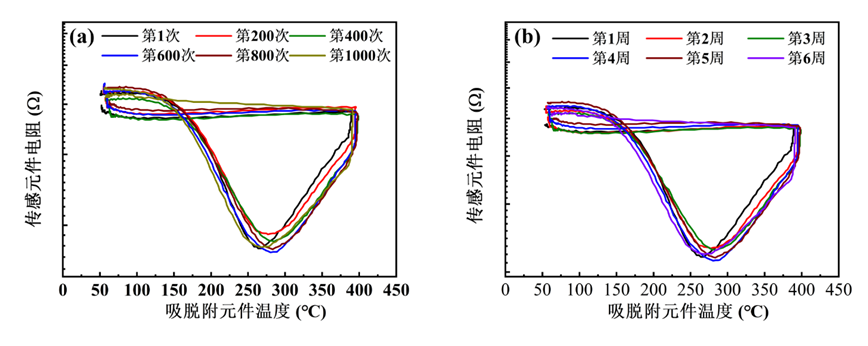 通过测试1000次传感器对40 ppm乙醇的响应来评估重复性,六周内每周测试一次传感器对40 ppm乙醇的响应来评估长期稳定性,结果如下图(a)和(b)所示。传感器在第1次和第1000次以及第一周和第六周对乙醇的脱附峰位高度及峰位对应的特征温度记录在下表中,最大偏差分别为5.6%和2.2%,表明基于片上程序升温脱附式的气体传感器具有优异的可重复性及长期稳定性。