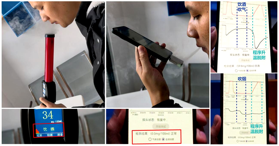 下图为烟气抗干扰的对比实验及结果,首先将两款检测仪按照标准调试至待测状态,随后样本人员(未食任何含酒精的食物)分别对其进行吹烟气测试。商用检测仪在吹烟后显示酒驾(血液浓度标记为34 mg/100 ml),而U盘式检测仪显示未饮酒(血液浓度标记为0 mg/100 ml)。从App界面的原始电阻响应曲线可以看出,饮酒后吹气时传感器出现明显的脱附峰位信号,而未饮酒仅吹烟时传感器未出现该信号。虽然在吹气阶段传感器出现了电阻响应,这是由于烟气可部分穿过吸脱附元件扩散至传感元件从而造成响应。而程序升温脱附阶段无脱附信号产生,说明在该温度调制参数下,吸脱附元件几乎不吸附烟气。以上结果表明,相较于商用酒驾检测仪,所开发的U盘式检测仪表现出极具竞争力的乙醇高选择性检出能力。