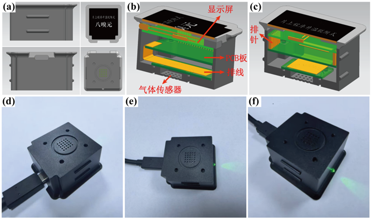 将片上程序升温脱附式阵列气体传感器集成到扩散式嗅觉终端上,形成了便携式白酒检测仪,如图所示。该设备的主体功能包括传感器(微热板传感芯片)、显示屏、PCB板和排线,排线用于连接传感器和PCB板,显示屏实施显示设备检测状态,基于该设备进行同类型白酒数据库的建立、模式识别算法的构建以及样本的实测验证,从而评估高选择性识别能力。