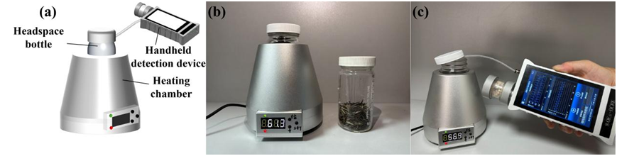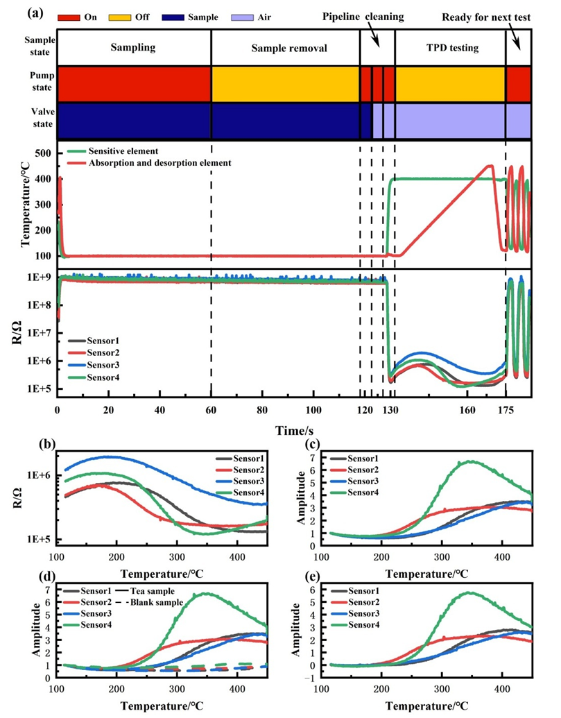 因此,我们提出采用片上程序升温脱附谱方法来获取样品的谱学信号。该方法的核心优势在于通过对样本挥发物进行萃取与浓缩,再通过程序升温脱附获得特征谱线,从而显著增强传感器响应,并放大不同样品间的细微差异。这使得该方法尤其适用于区分气味高度相似的复杂体系,为实现高精度识别提供了一种新颖而有效的技术途径。